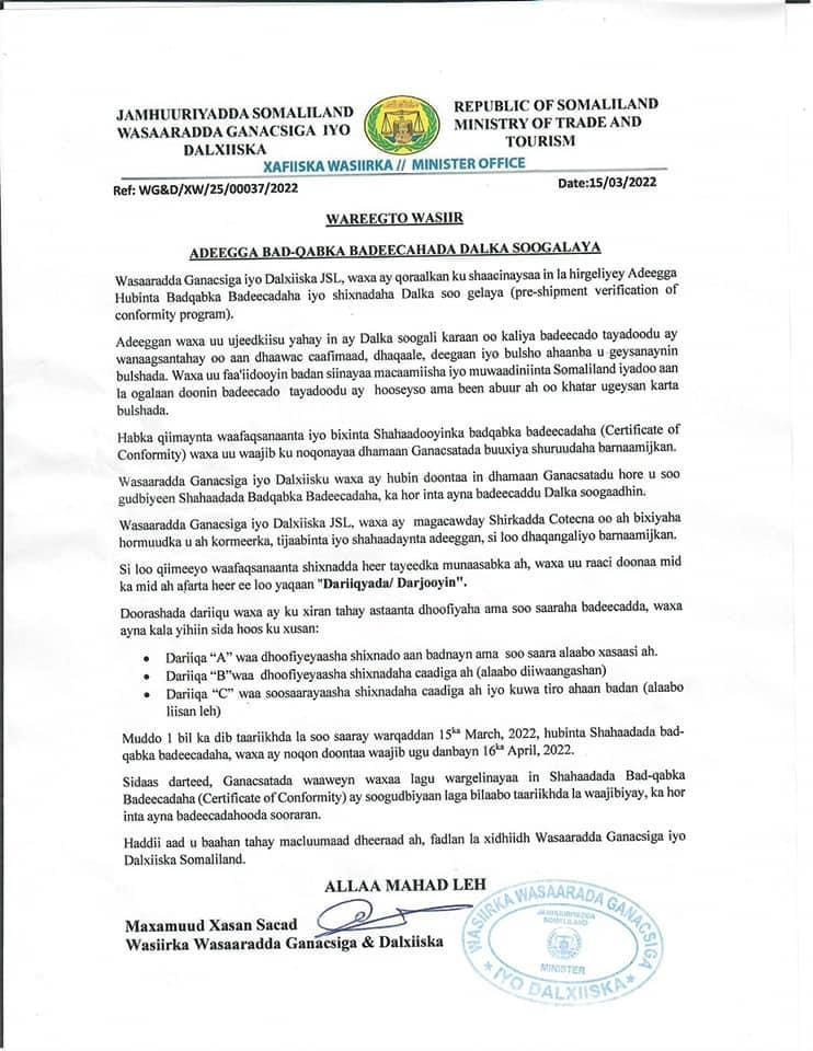 Wasiirka ganacsiga Somaliland ayaa wareegto laga soo saaray shalay xafiiskiisa isagoo dalka dibadiisa ku maqan u xilsaaray shaqadii hubinta tayada badeecadaha iyo bixinta shahaadada badqabka Badeecadaha dalka soo galaaya shirkad gaar loo leeyahay oo lagu magacaabo contecna.